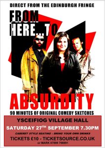 As part of its current “post-pandemic, pre-apocalypse” tour, the quick-fire satirical sketch show, From Here to Absurdity, is returning to Ysceifiog this autumn and will perform at the Village Hall