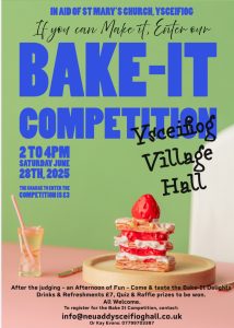 St Mary’s Church Ysceifiog are holding their “If you can make it join our Bake it” Competition. The exciting event is being held at Ysceifiog Village Hall Saturday June 28th